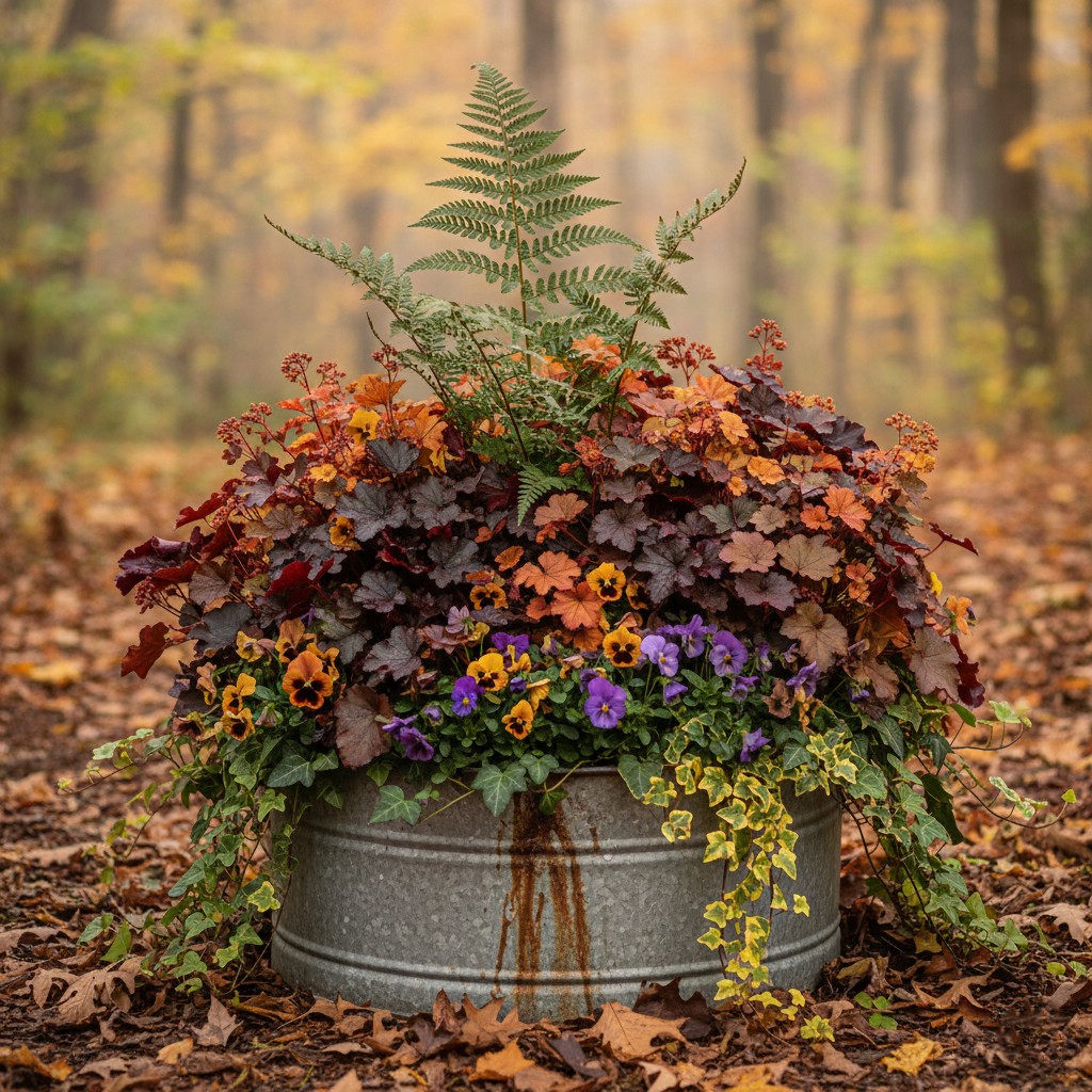 Plants: Autumn fern (switches beautifully to fall tones), Heuchera (coral bells—choose oranges or reds), Autumn pansies, Ivy, Creeping Jenny (turns golden-bronze in cool temps)