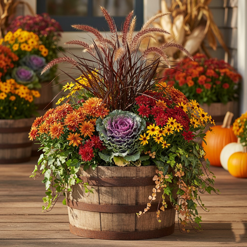 Plants: Ornamental millet or burgundy fountain grass, Garden mums, Ornamental kale/cabbage, Rudbeckia (Black-eyed Susans), Trailing ivy, Creeping sedum, Sage (its velvety leaves pair perfectly with fall tones)