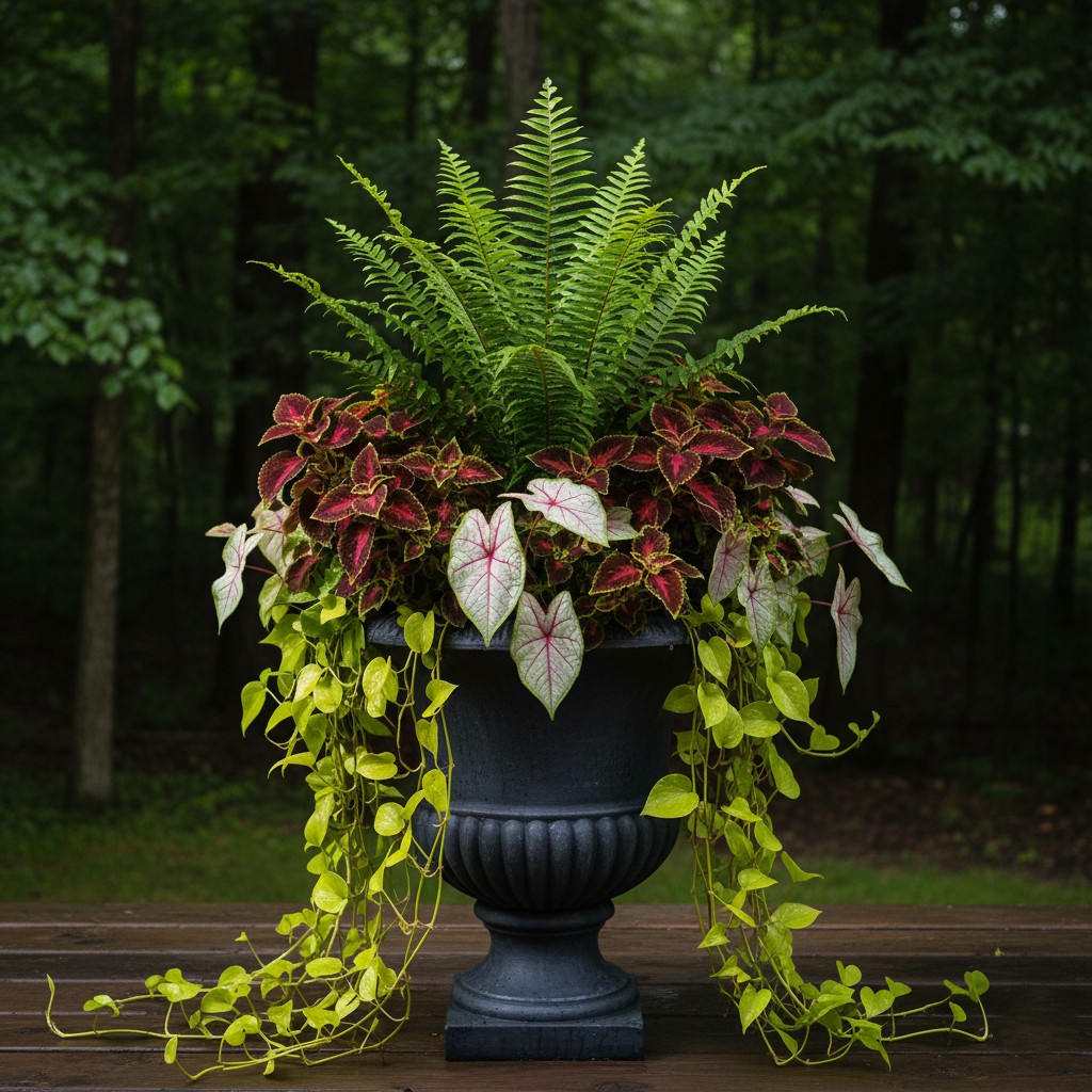 Foliage steals the show—heat-loving and dramatic, this tropical mix thrives even in deep shade.