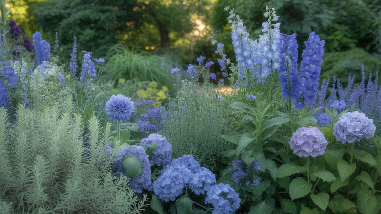 Silver, gray-green, and soft sage foliage enhances blue blooms and keeps the palette cohesive.