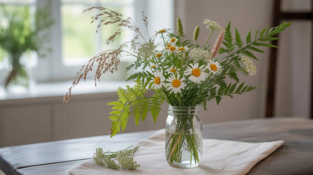 This charming little mix feels like a walk through a summer meadow. It’s light, airy, nostalgic, and blissfully simple. Because it uses inexpensive daisies and foraged greens, it’s one of the most economical arrangements—but also one of the most cheerful. A perfect “just because” bouquet for any corner of the home.