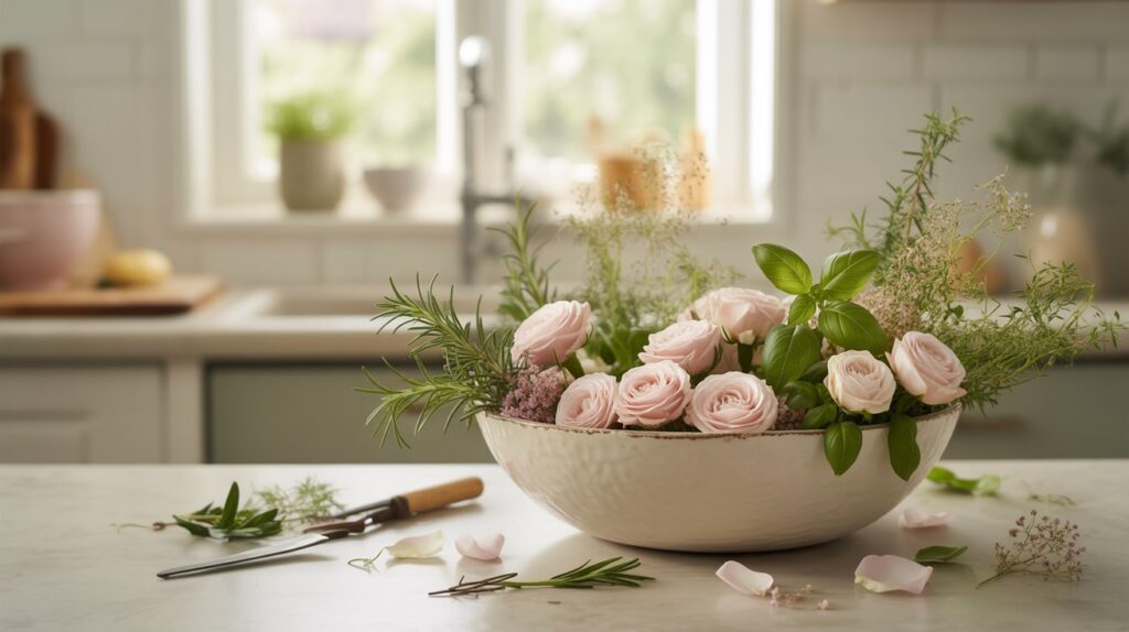 Soft, fragrant, and airy—this arrangement blends inexpensive roses with herbs from your windowsill for a dreamy, elevated feel.