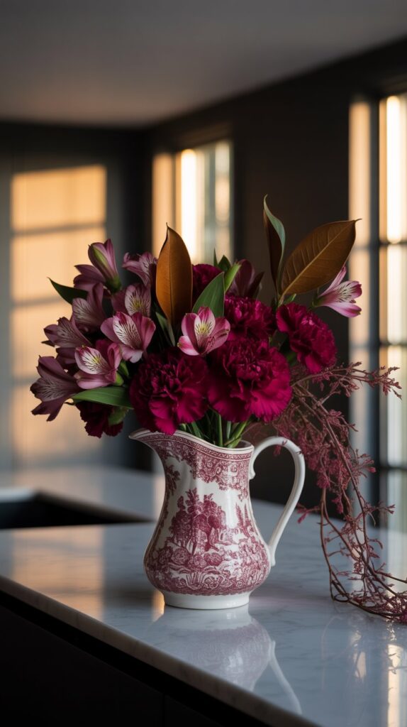 If you love rich, dramatic florals but not the high price tag, this one is for you. Dark carnations look surprisingly couture when paired with backyard magnolia leaves, creating a boutique, editorial feel. It’s the kind of arrangement that instantly makes a room feel styled—no designer florist required.