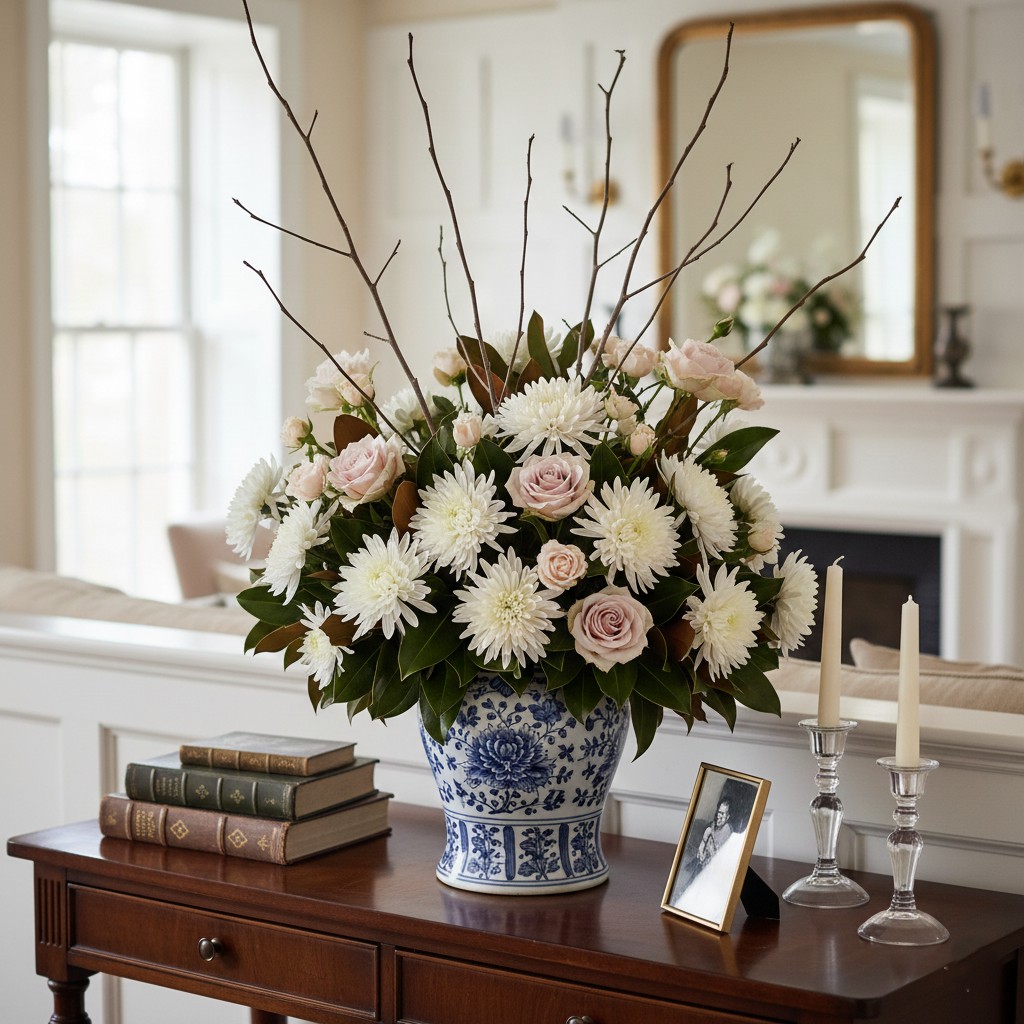 It’s effortlessly elegant. Blue-and-white ginger jars elevate even the most inexpensive stems and look stunning on dining tables, fireplace mantels, and entry consoles.