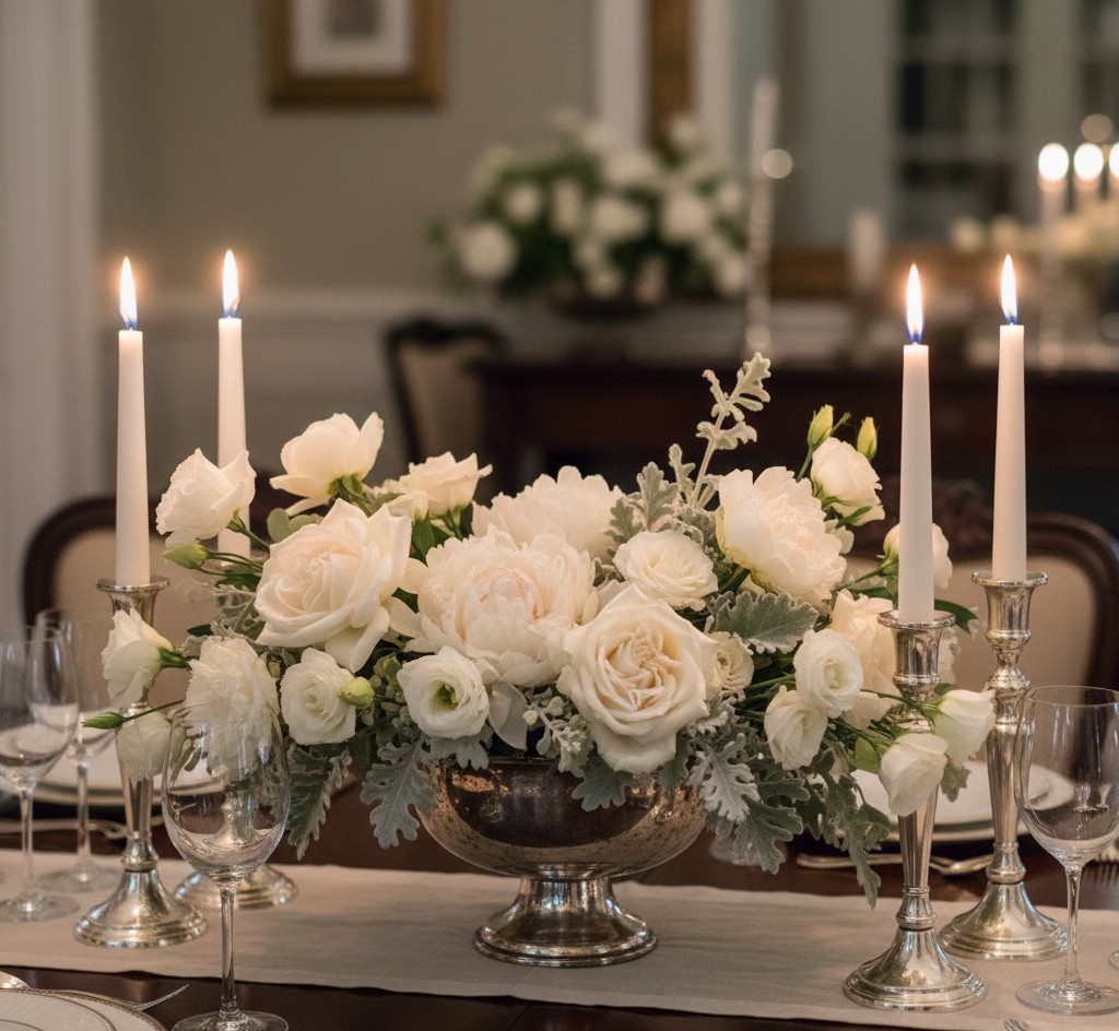 It’s pure vintage glamour. A low silver bowl creates a timeless, luxurious feel—perfect for dinner parties, holidays, and elegant tabletops.