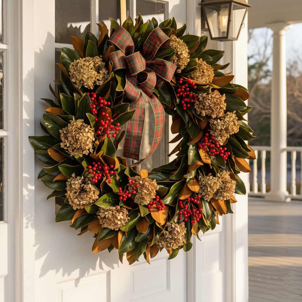 A few gold-tipped magnolia leaves or metallic seed pods add a festive glow without overpowering the natural palette.