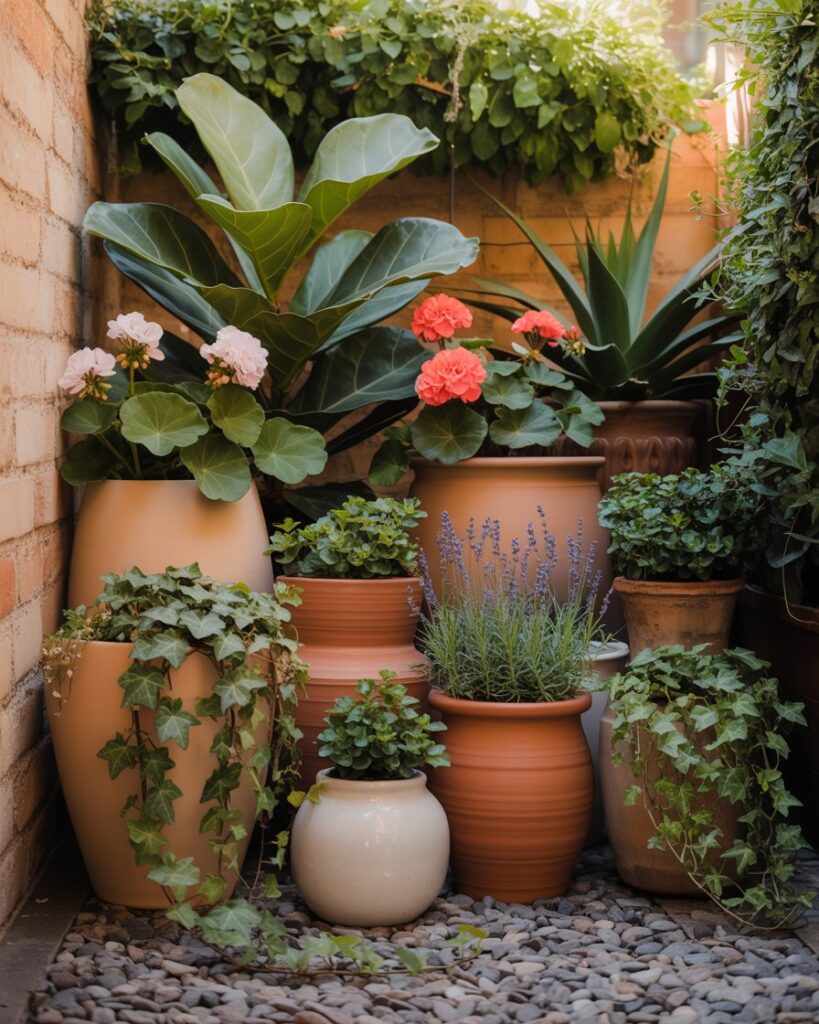 Group in odd numbers for a natural look. Mix textures like aged terracotta, glazed ceramic, and woven baskets.