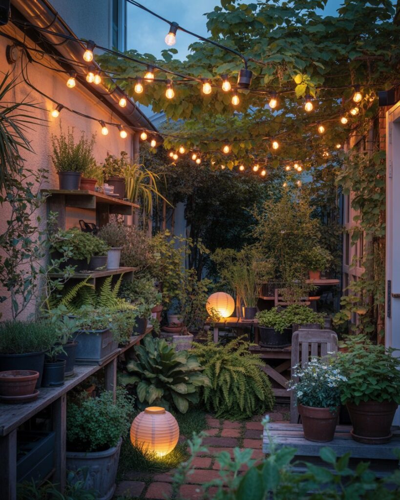 Even a tiny garden can feel enchanting after sunset.