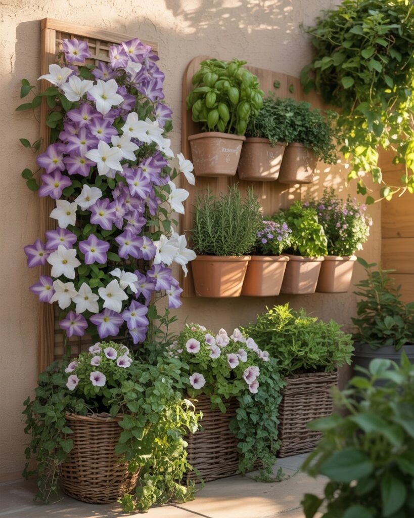 Climbing plants, trellises, and wall planters add visual height and instantly make a small garden feel layered and established.